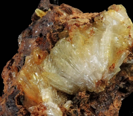 | Description: | Lustrous transparent yellow adamite crystals on brown limonite gossan. The adamite crystals are prismatic form in fan-shaped aggregates of radiating crystals. |