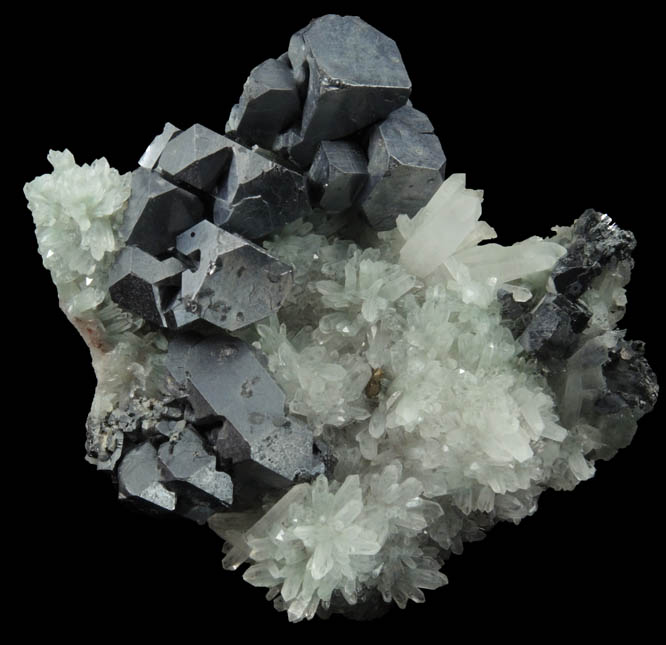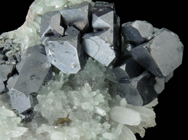 | Description: | Lustrous gray-metallic galena crystals to 13 mm on translucent greenish quartz crystals to 8 mm. The galena crystals are cubic form with octahedral corner faces and are in groups of parallel crystals that reflect simultaneously. |