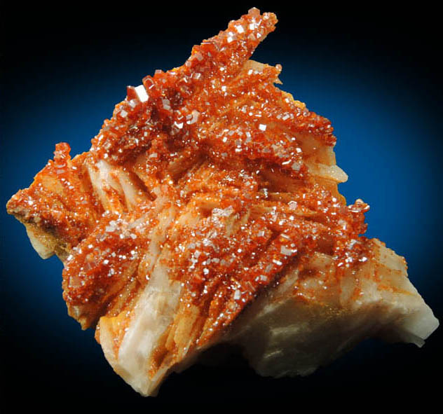| Description: | Lustrous transparent-to-translucent red-orange vanadinite crystals to 2 mm overgrown on the top surfaces of bladed translucent white barite crystals to 20 mm. The vanadinite crystals are hexagonal form with secondary pyramidal edge faces. Collected ca. 1995 |