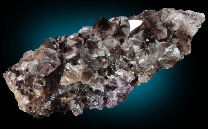 | Description: | Elongated plate of lustrous transparent smoky-to-purple amethyst quartz crystals. |