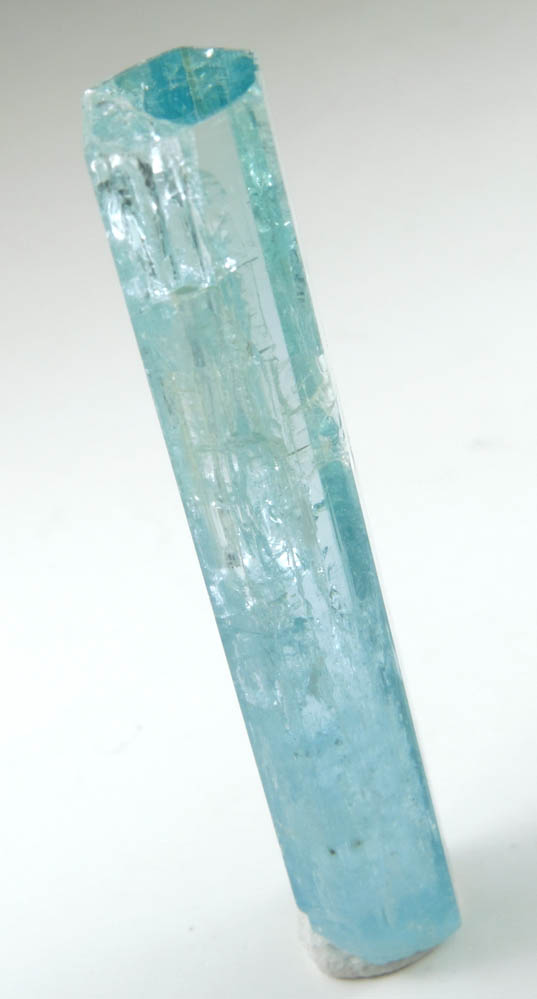 | Description: | Lustrous transparent blue aquamarine crystal, the blue gem variety of the mineral species beryl, with flat basal pinacoid termination modified by first-order pyramidal edge faces. The aquamarine crystal has unusual deep-blue color with no greenish tint. Weight: 7.1 grams |