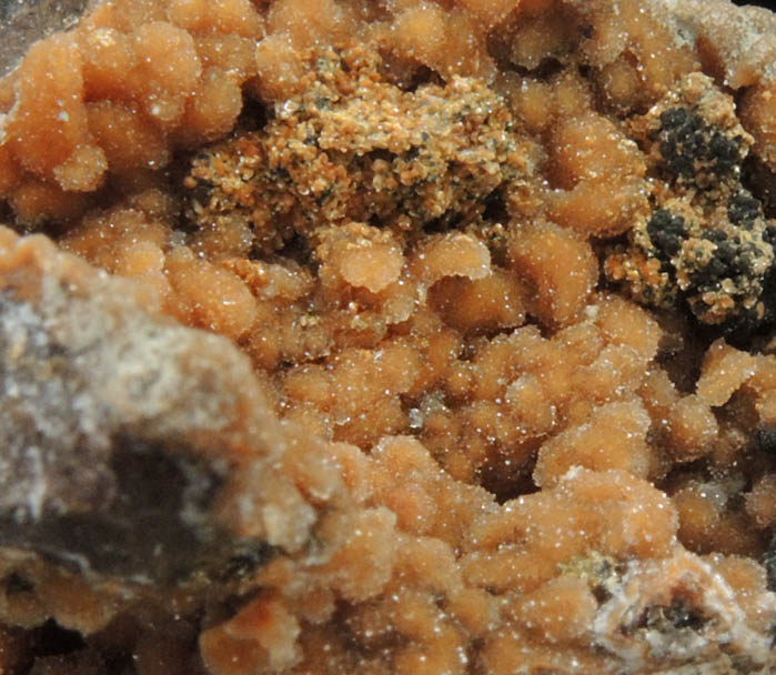 | Description: | Sparkling sugar-like colorless quartz microcrystals coating rounded aggregates of brown descloizite crystals with some uncoated exposed late-growth orange-brown descloizite crystals. From my personal collection; collected in 1995. For locality info see: The Finch Mine and Vicinity, Gila County, Arizona in Mineralogical Record v.26 #5 |