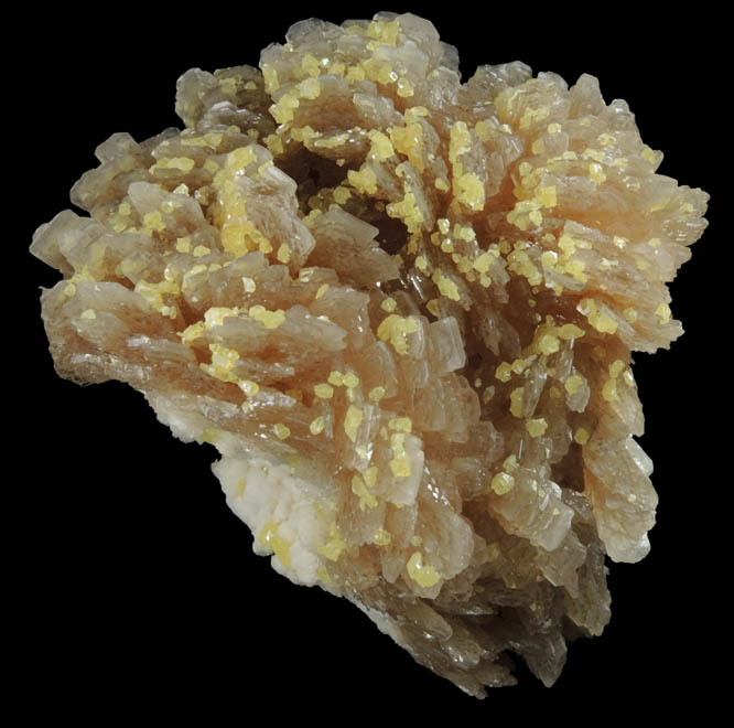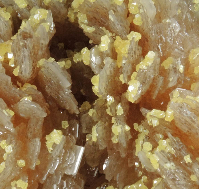 | Description: | Lustrous bladed translucent brown barite crystals to 10 mm with translucent yellow sulfur crystals to 1 mm sprinkled over the terminations of the barite crystals. Ex. Martin Farber collection; ex. Lesnicks |