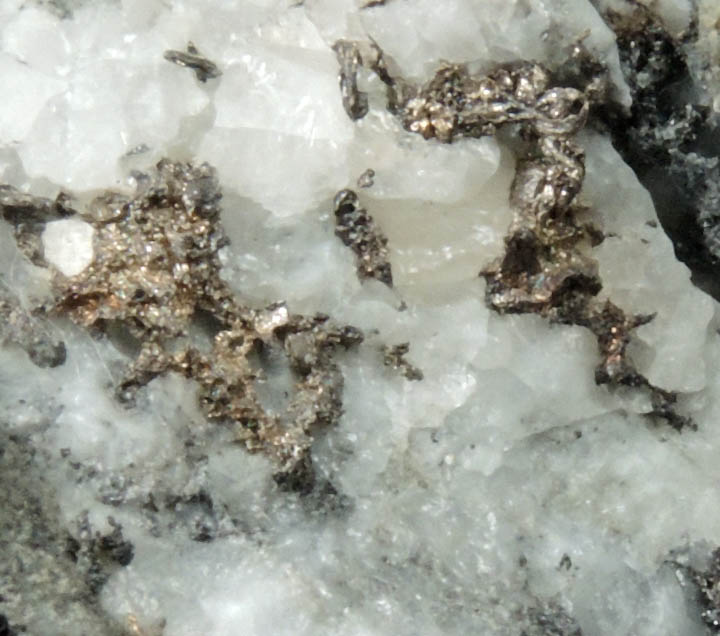 | Description: | Lustrous native silver (naturally occurring silver) in translucent white quartz with unidentified gray-metallic sulfide minerals. Collected ca. 1980 |