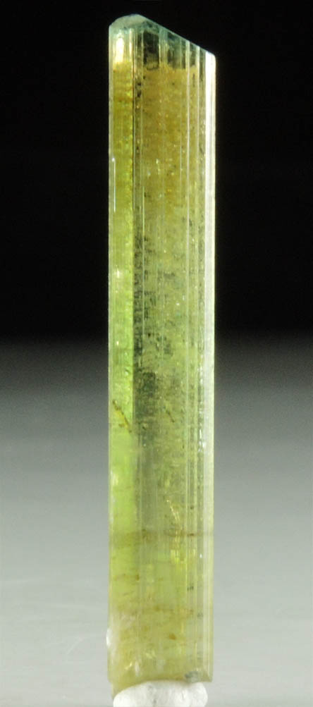 | Description: | Lustrous transparent green elbaite tourmaline crystals with thin blue zone at the termination. The elbaite crystal is striated prismatic form with angled pyramidal termination. The rear prism face is coated with many microscopic elbaite crystals. Collected ca. 1990. Weight: 0.7 grams |