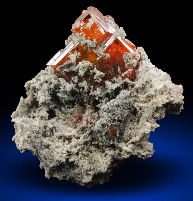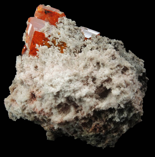 | Description: | Lustrous transparent orange wulfenite crystal intergrown with gray-to-white finely crystallized willemite that fluoresces brightly under SW UV illumination. The non-fluorescent part of the matrix is calcite. Collected ca. 1980 |