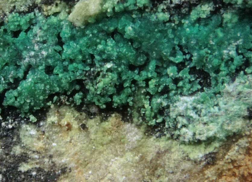 | Description: | Translucent green bayldonite microcrystals in spherical rosette-shaped aggregates to 0.2 mm with crusts of translucent brown jarosite microcrystals. The bayldonite crystals are on the front and rear faces. |