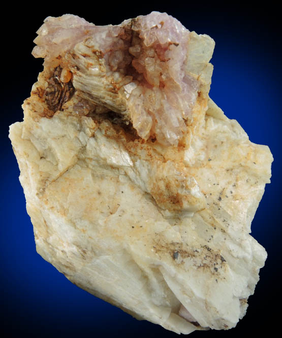 | Description: | Lustrous transparent pink rose quartz crystals on platy muscovite mica crystals and white albite with brown microcrystals of assorted phosphate minerals. The rose quartz crystals are distinct, with lustrous faces, and good color. Collected in June 1969 by Cliff Trebilcock |