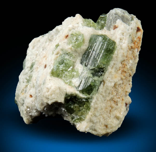 | Description: | Lustrous transparent green elbaite tourmaline crystal segment embedded in albite-quartz matrix. The elbaite tourmaline crystal has a gemmy sections on the right end. More elbaite tourmaline crystals are on the rear. From my personal collection; collected on the Boston Mineral Club field trip when the dumps were being graded during golf course construction ca. 1994 |