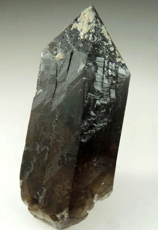 | Description: | Lustrous doubly-terminated transparent smoky quartz crystal with muscovite mica on the termination. The smoky quartz crystal has many angled corner faces on adjacent corners indicating twinning following the Dauphiné Law of quartz twinning. Ex. Thomas A. Penney (1934-2019) collection, collected in the 1970s |