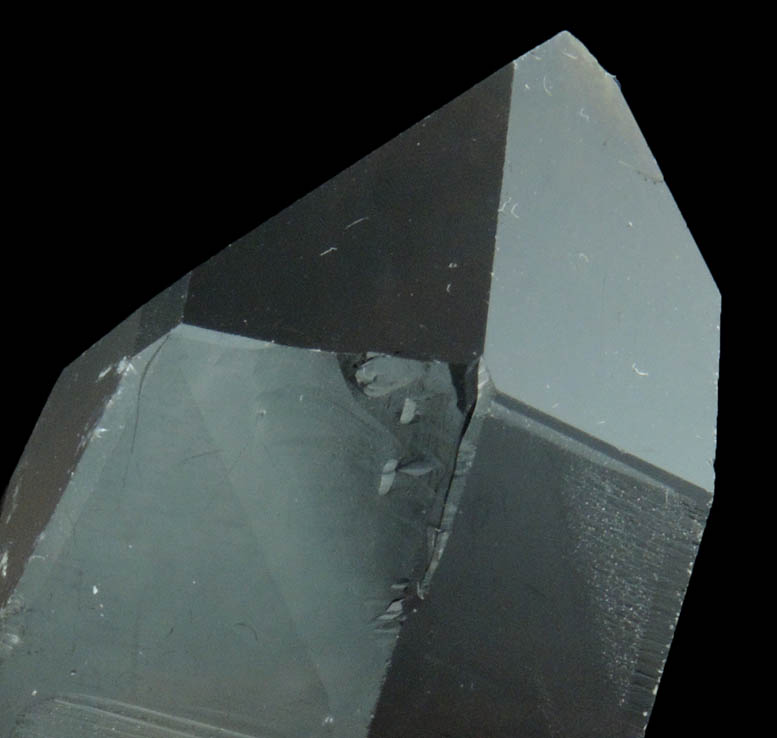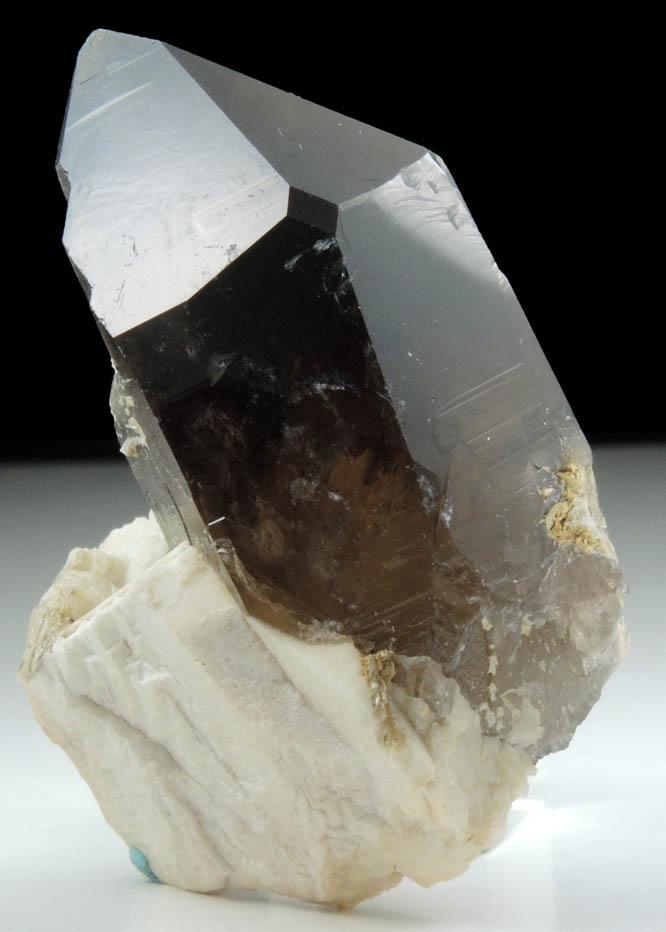 | Description: | Lustrous transparent smoky quartz crystal on white microcline with muscovite mica on the rear faces. The smoky quartz has etched, well-defined {7181} faces on adjacent corners indicating it is twinned following the Dauphiné Law of quartz twinning. Ex. Thomas A. Penney (1934-2019) collection, collected in the 1960s-70s |