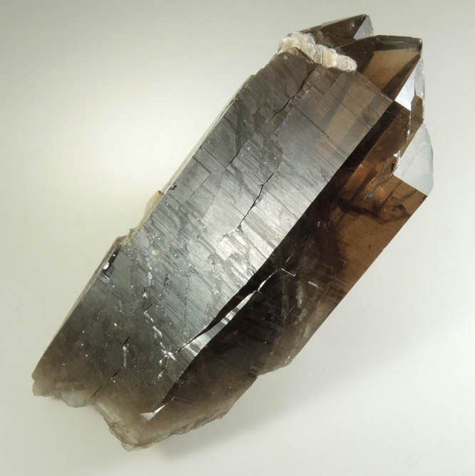 | Description: | Lustrous parallel transparent smoky quartz crystals with bladed muscovite mica crystals on the rear and upper edge. The smoky quartz has complex suture patterns on the prism faces indicating twinning following the Dauphiné Law of quartz twinning. Ex. Thomas A. Penney (1934-2019) collection, collected in the 1960s-70s |