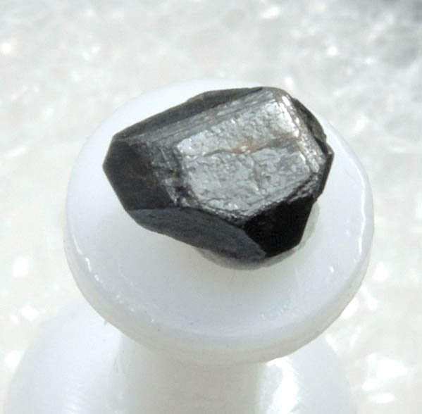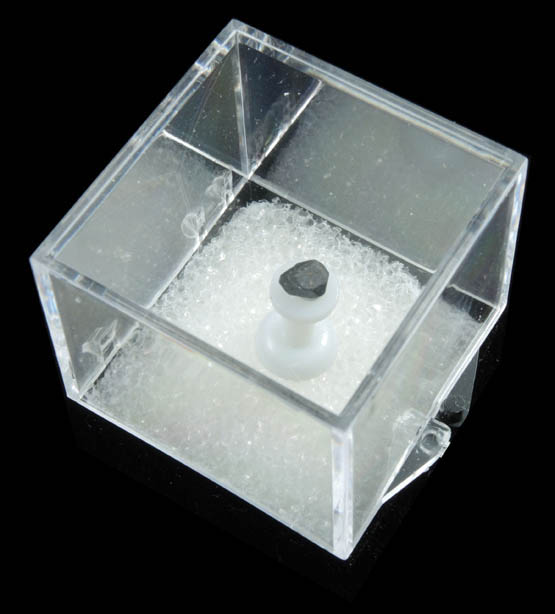 | Description: | Lustrous black uraninite crystal with no matrix attached mounted in an acrylic Perky-style display box for easy handling. The uraninite crystals is distorted cubo-octahedral form with brown remnants of matrix on one face. Collected ca. 1996. Radioactive |