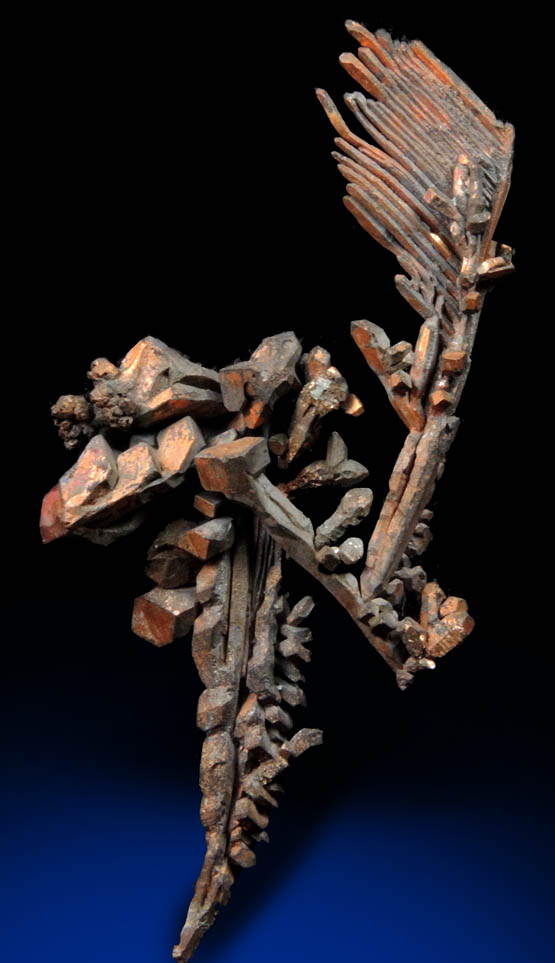 | Description: | Superb sharp native copper crystals (naturally occurring copper crystals) with large blocky crystals to 7 mm and groups of parallel copper crystals in herringbone habit that are twinned following the Spinel Law of twinning. The copper has natural patina. Collected in 2005 |