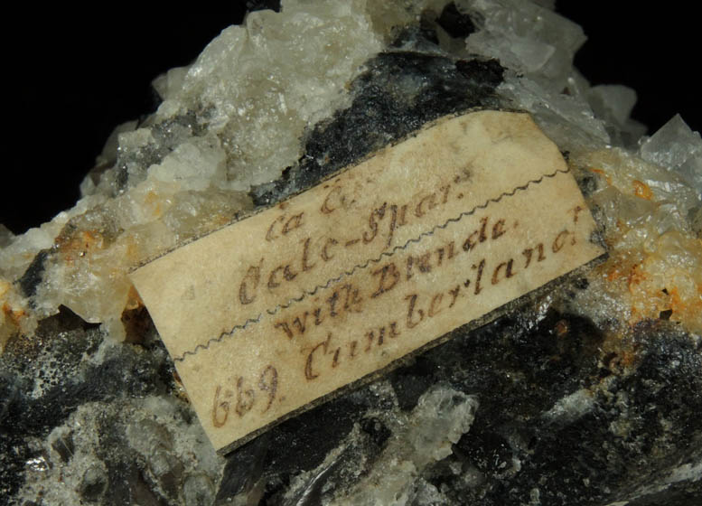| Description: | Lustrous translucent colorless quartz crystals to 6 mm with prismatic translucent gray hexagonal calcite crystals to 15 mm and lustrous black sphalerite crystals to 4 mm. With old pen-and-ink label on one edge from the infamous Lord Calvert. Ex. John F. Lord Calvert (1825-1897); purchased in 1938 by Martin Ehrmann (1904-1972); ex. John S. Albanese (1898-1969); ex. John E. MacDonald (1933-2009) |