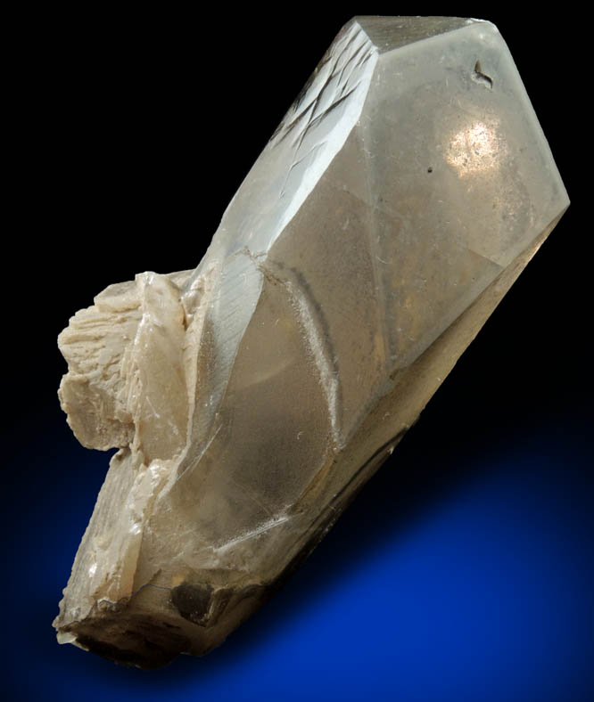 | Description: | Large lustrous transparent yellow-brown barite crystal with smaller barite crystals around the base. The main barite crystal has translucent phantom-growth zones in the lower portions of the crystal. Ex. D. Miller collection #M1605, collected in 2011-2012 |