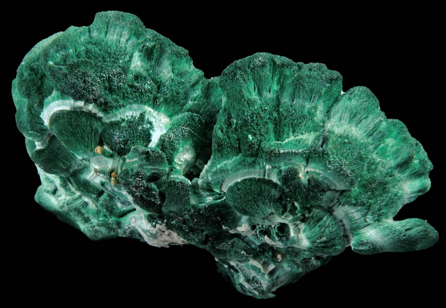 | Description: | Fibrous green malachite crystals in mushroom-shaped tapered aggregates to 15 mm with rounded top surfaces. The fibrous structure of the malachite crystals is visible on the bottom and cause chatoyant luster on the surfaces. |
