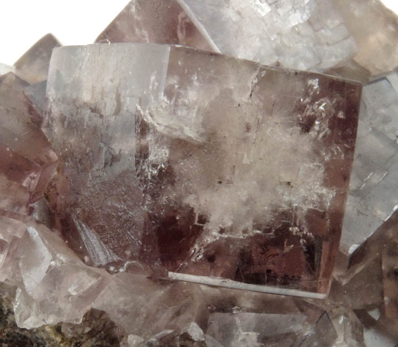 | Description: | Lustrous transparent purplish-gray cubic fluorite crystals in a rounded formation that crystallized over a core of black sphalerite. The fluorite crystals have cloud-like white inclusions in the center of the faces with transparent crystal corners. |