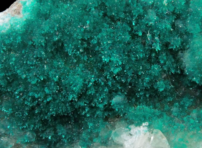 | Description: | Rich specimen of lustrous transparent green dioptase crystals to 0.4 mm almost completely covering lustrous transparent colorless calcite crystals to 2.2 mm. Collected by John Mediz ca. 1985 |