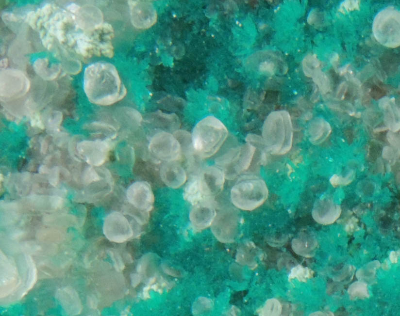 | Description: | Rich specimen of lustrous transparent green dioptase crystals to 0.4 mm with mushroom-shaped (or scepter-shaped) transparent colorless calcite crystals of flat circular calcite cap crystals to 1.5 mm over smaller stem calcite crystals. Collected by John Mediz ca. 1985 |