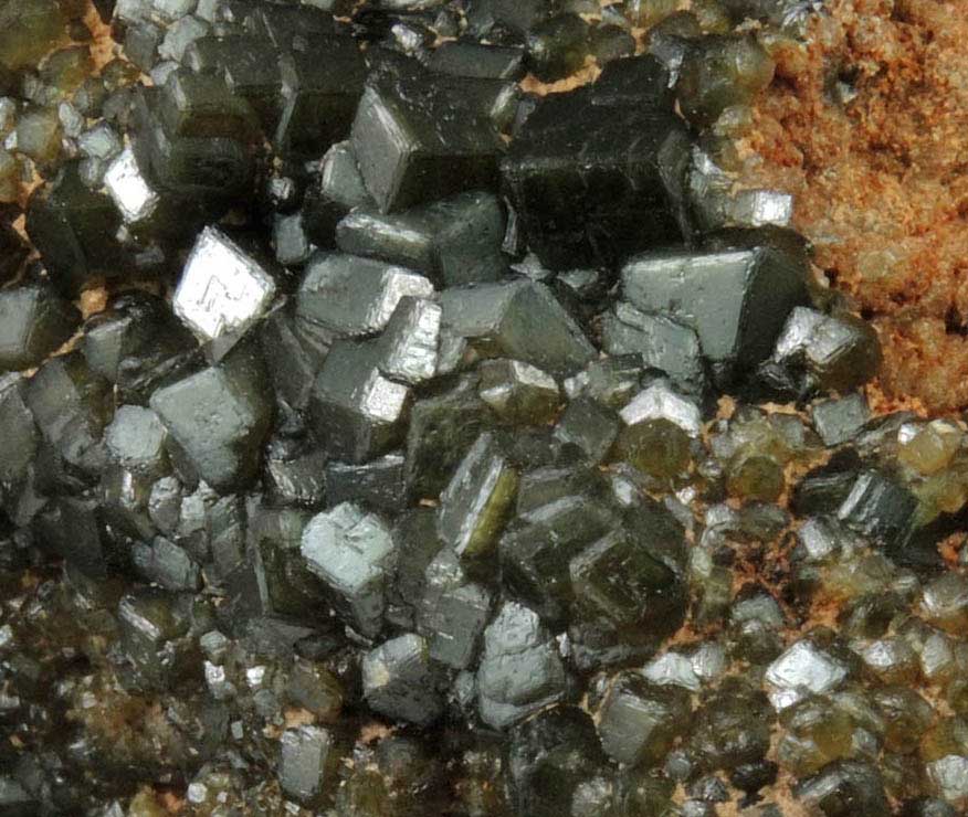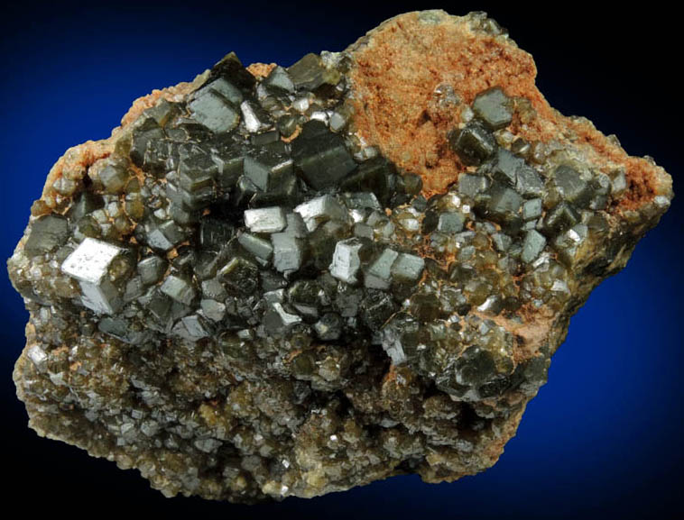 | Description: | Lustrous transparent dark olive-green andradite-grossular garnet crystals on brown garnet-rich matrix. The andradite-grossular garnet crystals are dodecahedral form with linear edge patterns. Both andradite and grossular garnets occur at the site. Collected ca. 1980 |