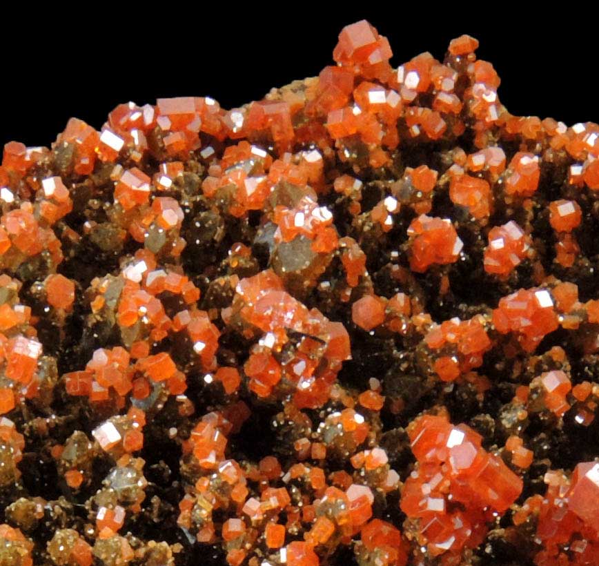 | Description: | Lustrous translucent red-orange vanadinite crystals to 2 mm overgrown on lustrous transparent colorless quartz crystals to 4 mm lining one face of brown matrix. Collected ca. 1980 |