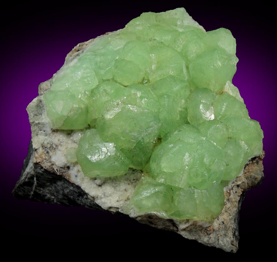 | Description: | Lustrous translucent green cuprian (copper-rich) smithsonite crystals covering one face gray matrix. The smithsonite crystals are distorted rhombic form with convex crystal faces that have silky luster caused by microscopic crystallization patterns. Collected ca. 1980 |