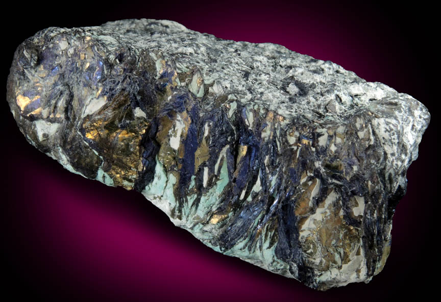 | Description: | Classic specimen of a compact crystallized mass of platy covellite crystals with remnants of white clay on the surfaces. The covellite crystals have iridescent luster that varies from yellow to blue. Collected ca. 1990 |
