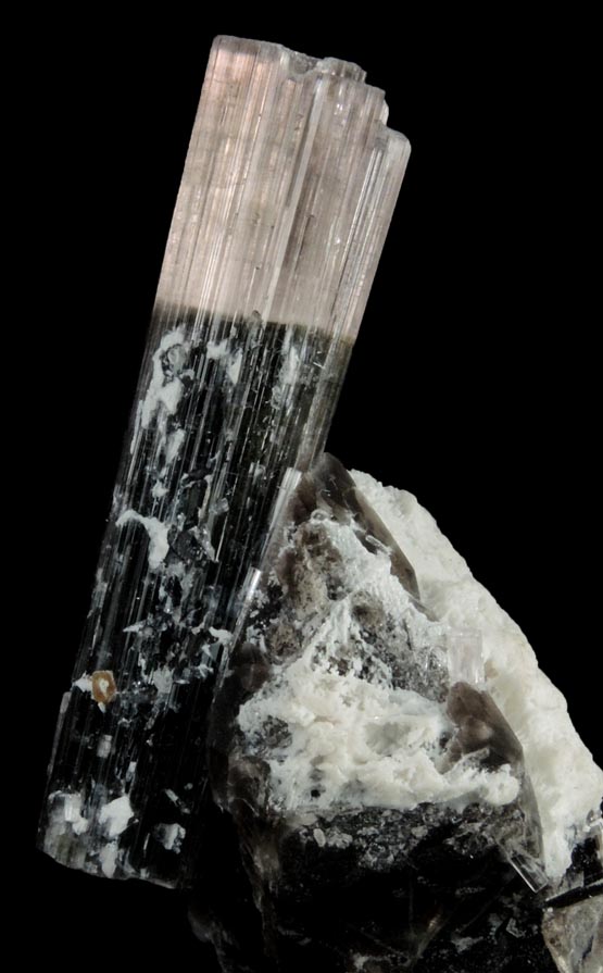 | Description: | Lustrous doubly-terminated 36 mm elbaite tourmaline crystal on a doubly-terminated 35 mm smoky quartz crystal with white albite inclusions on the surfaces. The elbaite tourmaline crystal is translucent dark-green with transparent pink termination zone. Ex. G. McLoughlin collection |