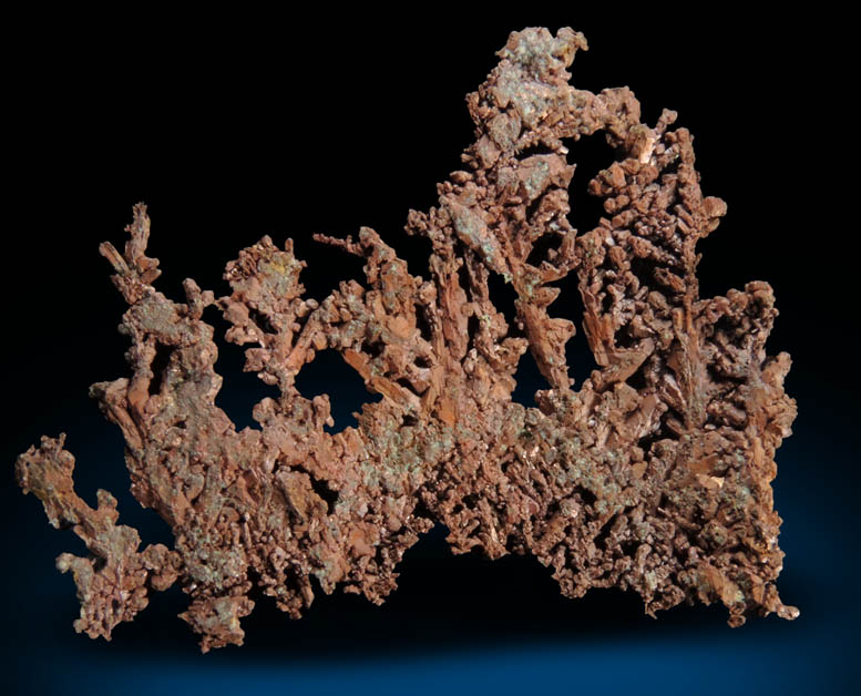 | Description: | Crystallized metallic native copper (naturally occurring copper) in arborescent formations of copper crystals that crystallized in a narrow fracture that restricted growth into a thin, flat formation with crystal faces in the open interstices. |