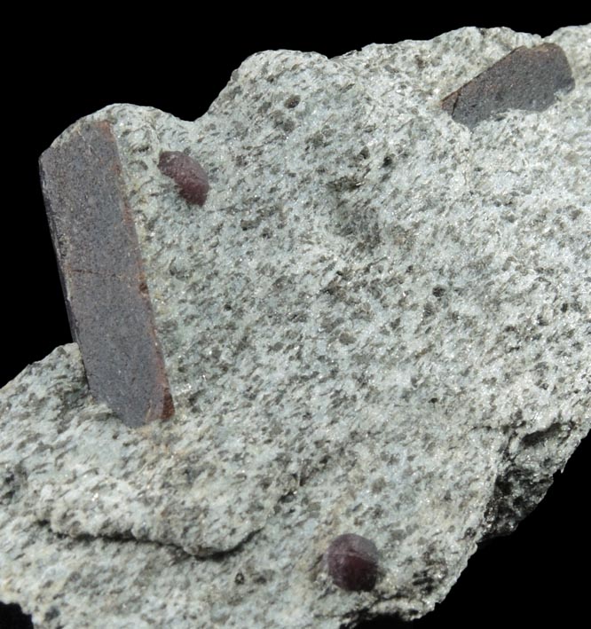 | Description: | Brown staurolite crystals to 19 mm embedded in fine-grained gray schist with dodecahedral dark-red almandine garnet crystals to 4 mm. The staurolite and almandine crystals are harder than the schist and are proud of the surface. From my personal collection. Collected ca. 1993 |
