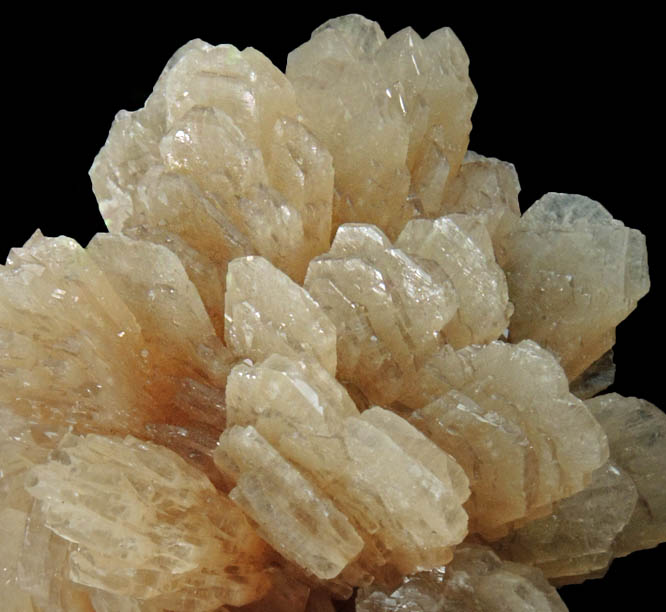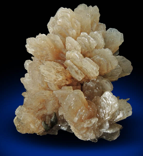 | Description: | Lustrous translucent brown bladed barite crystals in a plumose aggregates fully crystallized all around. The barite crystals fluoresce white under SW UV illumination and phosphoresce when illumination is extinguished. |
