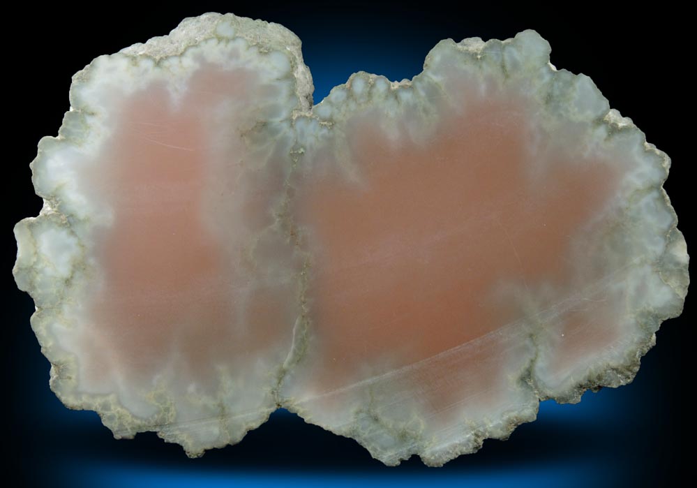 | Description: | Two interconnected translucent gray-to-pink datolite nodules that were sawn flat through the center to show the pink core color caused by microscopic hematite and copper inclusions. The sawn face was not polished or coated. From my personal collection, originally acquired from Hal Kramer |