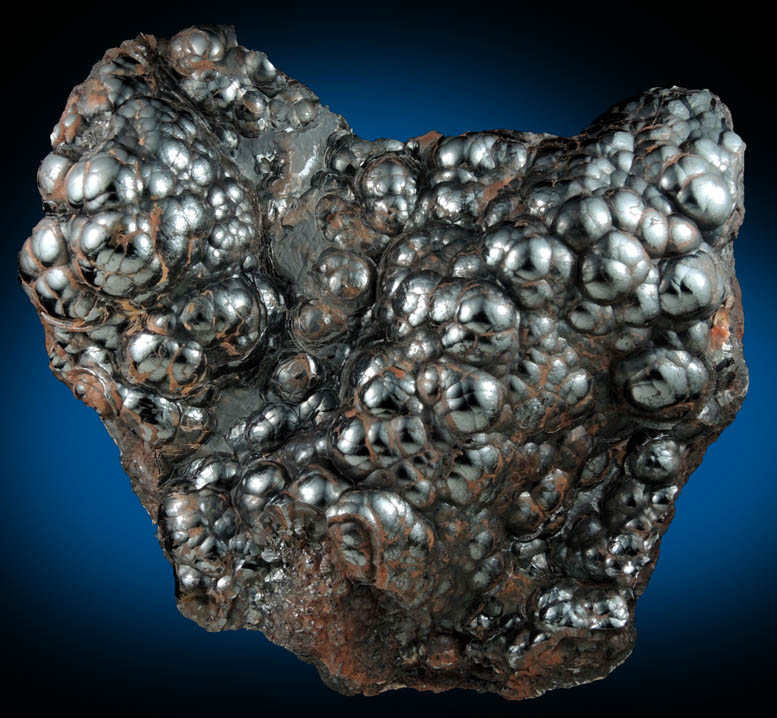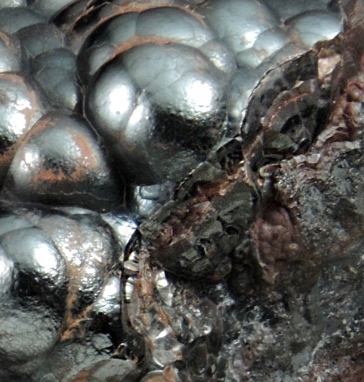 | Description: | Lustrous dark-metallic mammilary hematite, commonly called Kidney Ore by early miners, with red-brown limonite in crevices. Inspection under the microscope reveals crystallization patterns on the hematite surfaces and probably not polished. Collected April 1993 |