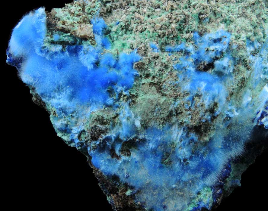 | Description: | Rich specimen of acicular (hair-like) blue cyanotrichite crystals to 2 mm covering one face of earthy green- brown matrix with minor blue translucent blue bladed azurite crystals under the cyanotrichite exposed along the bottom edge. Collected ca. 1970 |