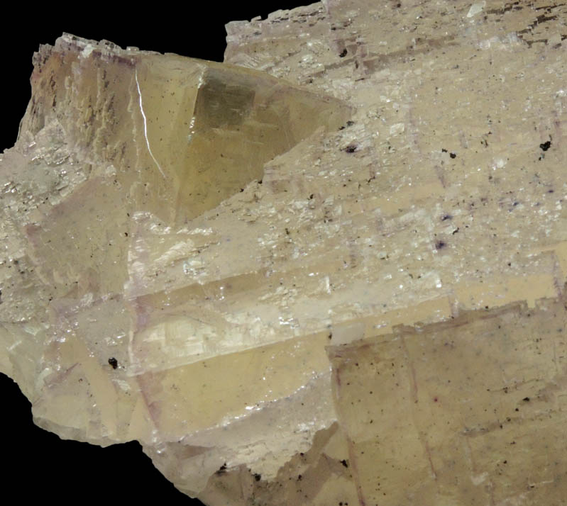 | Description: | Large transparent cubic fluorite crystals with surfaces of smaller parallel cubic faces and growth-hillocks resembling square stepped pyramids. The fluorite crystals have yellow core zones, thin purple outer zones, and minor bitumen in surface crevices. Collected ca. 1995 |
