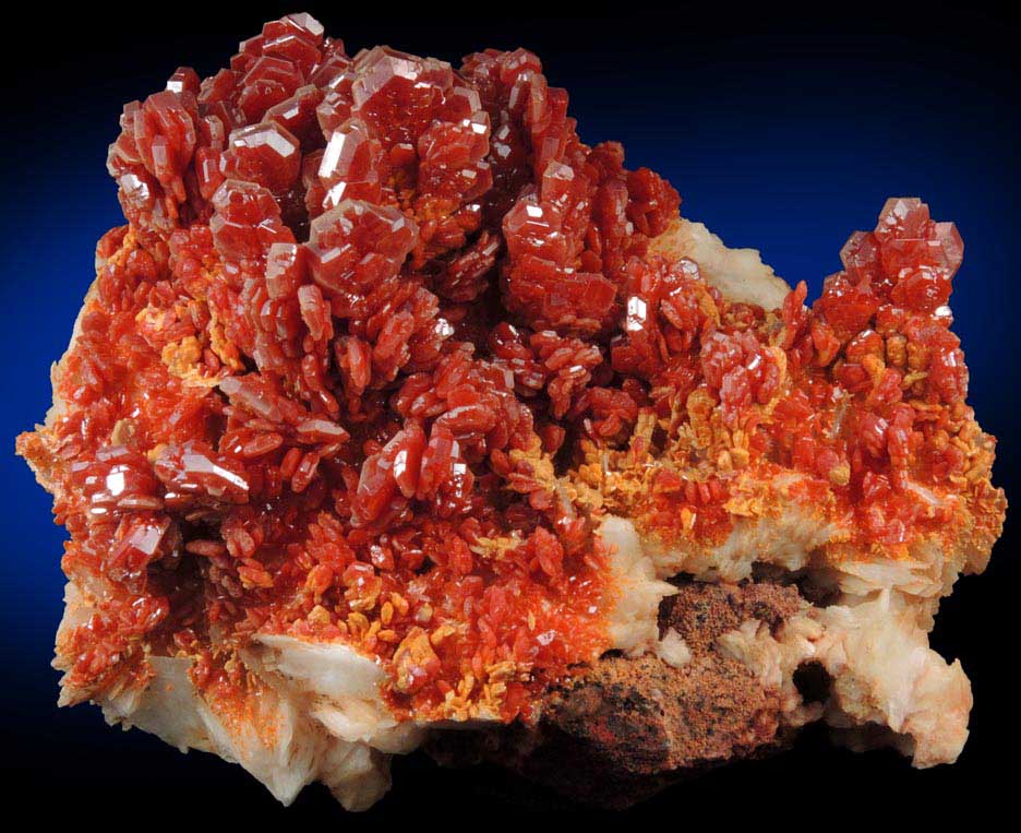 | Description: | Lustrous translucent red vanadinite crystals, with smaller yellow-orange crystals, over a plate of white barite crystals. The vanadinite crystals are tabular hexagonal form modified with {110, 120} edge faces and have brown subsurface inclusions on rear. Collected in 2011 |