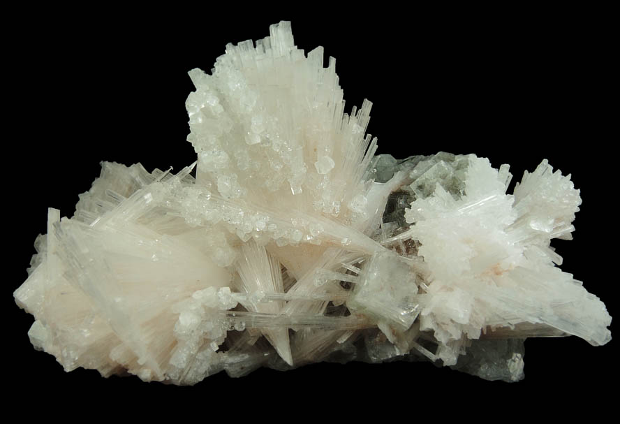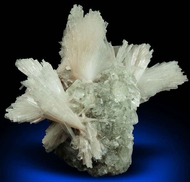 | Description: | Lustrous transparent colorless slender scolecite crystals to 30 mm in tapered spray-shaped aggregates over hemispherical groups to 22 mm diameter of transparent green apophyllite crystals to 8 mm, with individual apophyllite crystals on the scolecite. Collected in 2011 |