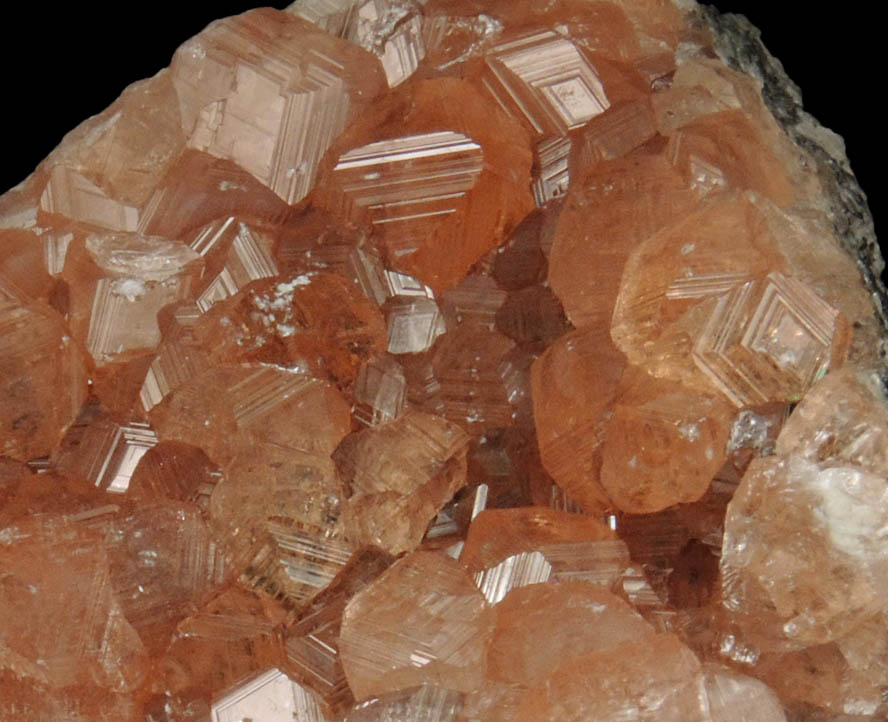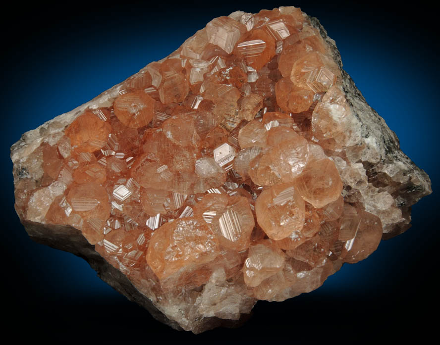| Description: | Large lustrous transparent grossular garnet crystals covering one face of diopside-rich matrix. The grossular garnet crystals are medium orange-brown color, striated dodecahedral form, with excellent internal clarity. Ex. B. Gaber collection, collected ca. 1985 |