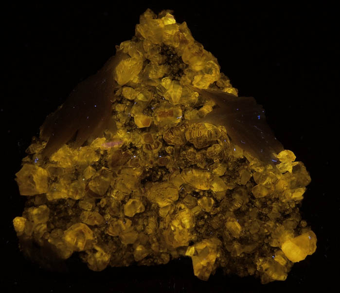 | Description: | Lustrous transparent gray cerussite crystals to 5 mm with bladed translucent pink-white barite crystals to 15 mm on a plate of galena-rich matrix. The cerussite crystals appear gray because the underlying galena is visible though the cerussite. Ex. E. Carmichael collection, acquired from Filer's (Redlands, California). Fluoresces yellow-orange under 365 nm LW UV illumination |