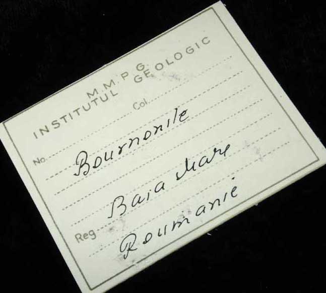 | Description: | Large museum specimen of lustrous black sphalerite crystals to 2.5 mm with cogwheel-twinned gray-metallic bournonite crystals to 4.5 mm intermixed with hair-like gray metallic boulangerite microcrystals and yellow-metallic pyrite crystals to 0.5 mm. Ex. W. B. Thompson collection; in exchange from Romanian Ministerul Minelor Petrolului si Geologiei, Institutul Geologic |