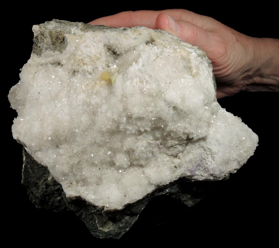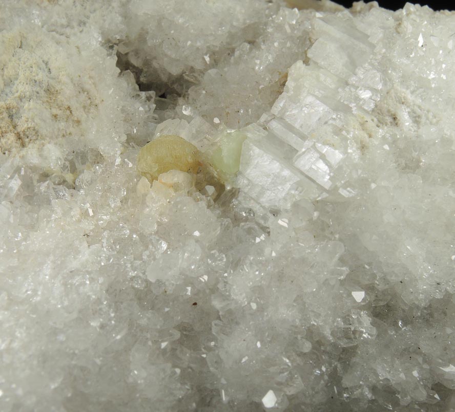 | Description: | Unusually large cluster of lustrous translucent pale-yellow (nearly colorless) heulandite crystals to 4 mm with transparent colorless rhombic calcite crystals to 5 mm on sparkling colorless quartz crystals to 4 mm plus green prehnite spheres to 6 mm. From my personal collection; collected ca. 1989 |
