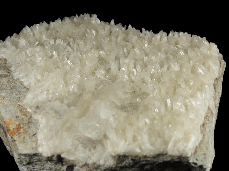 | Description: | Plate of lustrous transparent prismatic natrolite crystals to 6 mm completely coating one face of gray matrix with a rhombic colorless calcite crystal mixed in. The natrolite crystals have four-sided shallow pyramidal termination. Ex. E. Carmichael collection; collected ca. 1950 |