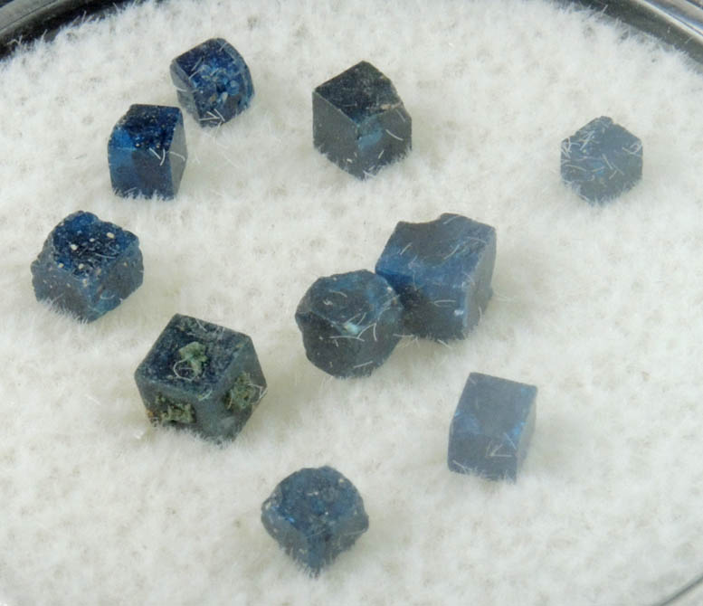 | Description: | Ten translucent dark-blue cubic boleite crystals in a 35 mm diameter display case. The boleite crystals have remnants of brown matrix on some surfaces. Collected ca. 1980 |