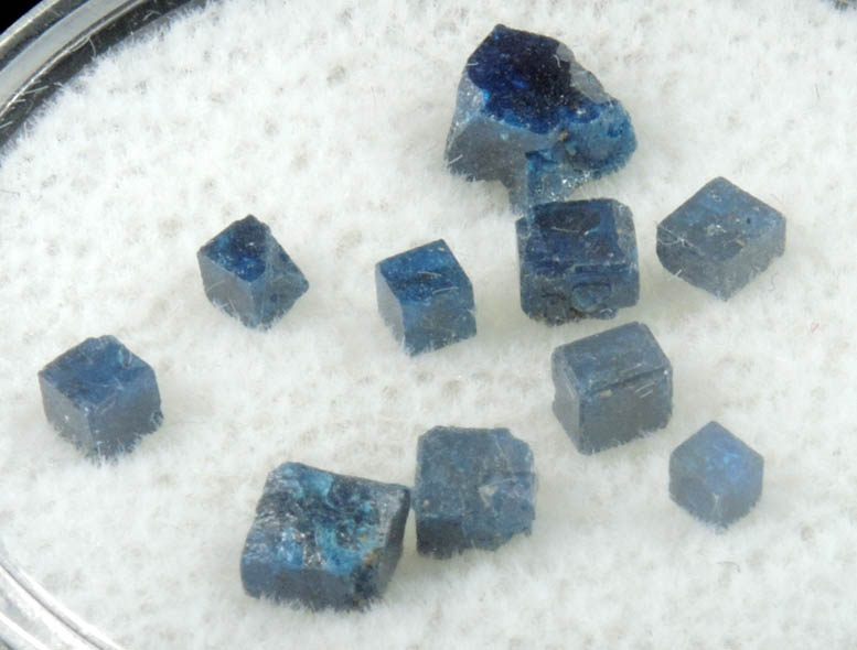 | Description: | Ten translucent dark-blue cubic boleite crystals in a 35 mm diameter display case. The boleite crystals have remnants of brown matrix on some surfaces. Collected ca. 1980 |