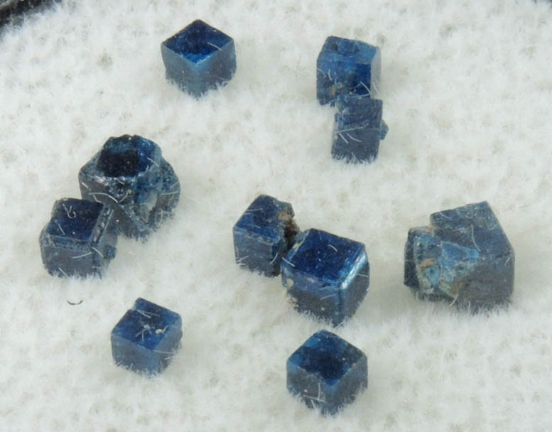 | Description: | Ten translucent dark-blue cubic boleite crystals in a 35 mm diameter display case. The boleite crystals have remnants of brown matrix on some surfaces. Collected ca. 1980 |