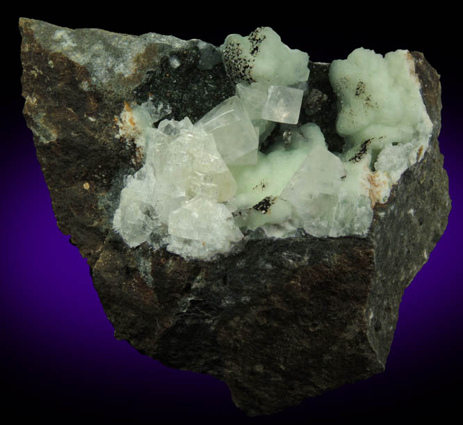 | Description: | Lustrous transparent cubic colorless calcite crystals to 7 mm on translucent green prehnite crystals to 3 mm in a shallow cavity in basalt with microcrystals of pyrite and julgoldite-pumpellyite. The calcite crystal fluoresces pink-orange under SW UV. From my personal collection; collected ca. 1989 |
