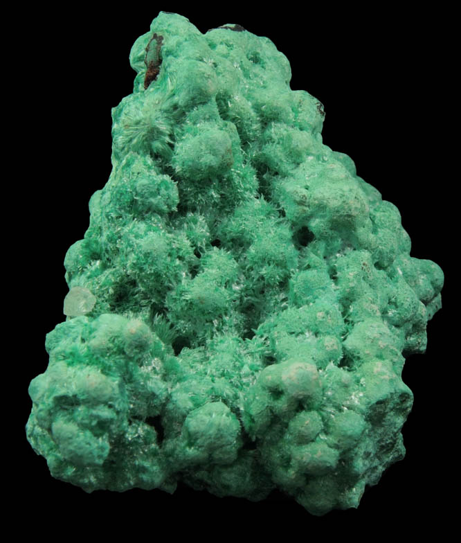 | Description: | Large cluster of brown jarosite microcrystalline mass (exposed in a few areas) almost completely coated with fibrous green malachite crystals in rounded aggregates to 8 mm. On the bottom are lustrous transparent colorless calcite crystals to 3 mm. Ex. Phillip Greybill (b. 1935- ) collection, collected ca. 1980 |