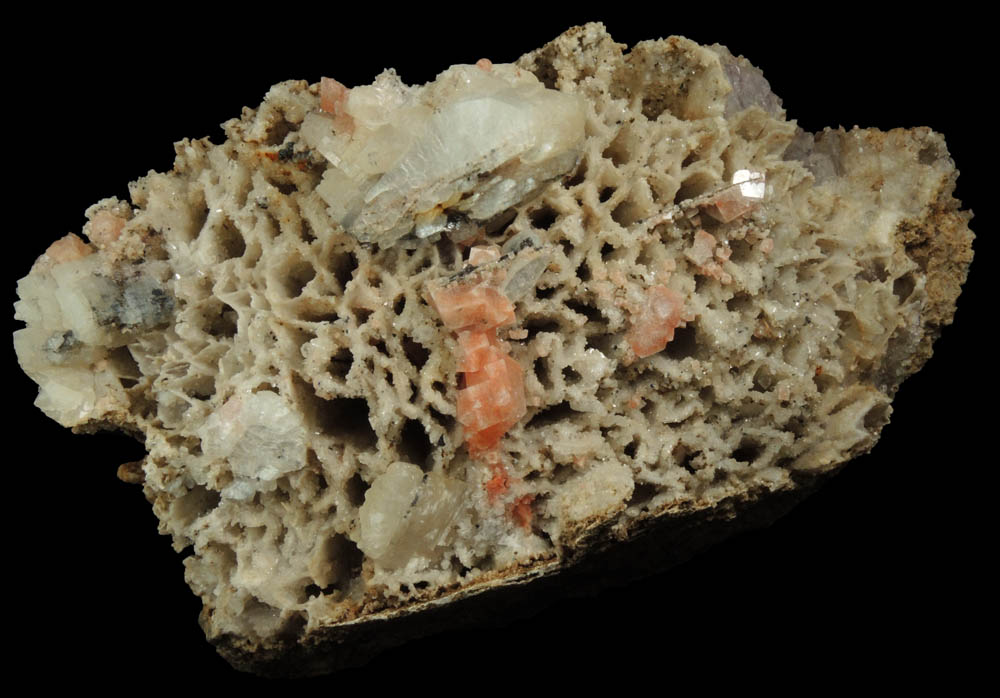 | Description: | Lustrous translucent pink-orange interpenetrant-twinned chabazite crystals to 8 mm and lustrous translucent pearly gray heulandite crystals to 28 mm on sparkling quartz microcrystal molds after tapered anhydrite crystals to 30 mm. |