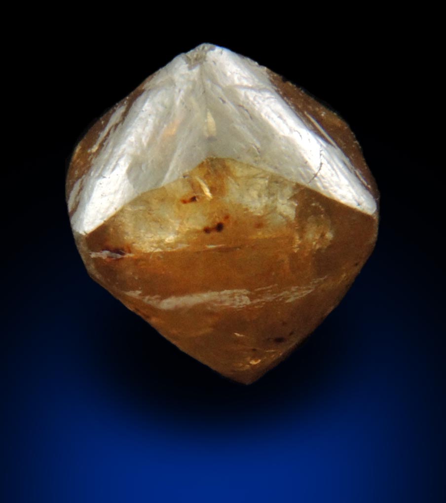 | Description: | Lustrous transparent orange-brown natural rough diamond with reflective internal flaws that give a sparkle suitable for jewelry. The diamond crystal is octahedral form with complex patterns on the faces and has scattered brown subsurface spots. |